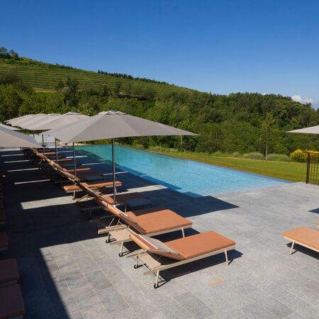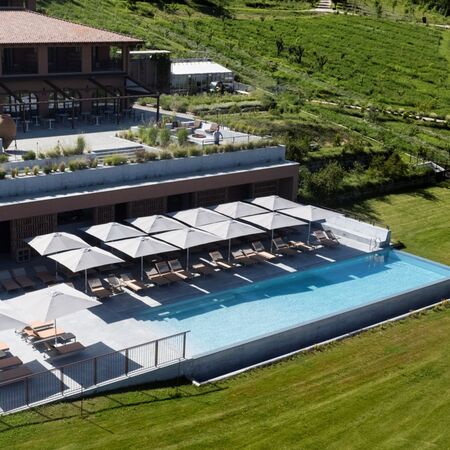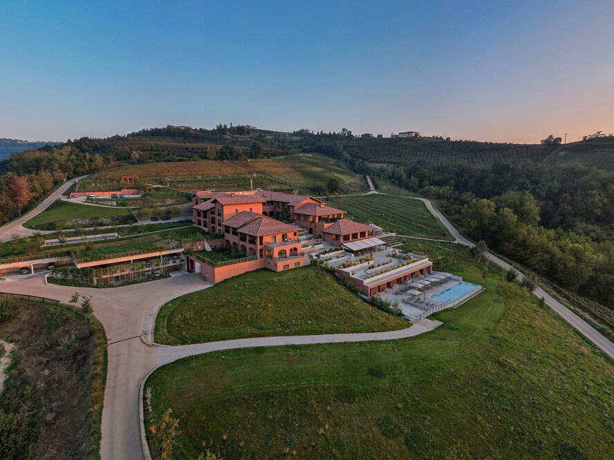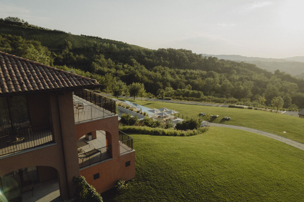 The resort's contemporary design harmoniously integrates with the natural landscape, utilizing indigenous materials and traditional Piedmontese techniques. Every detail honors the UNESCO World Heritage setting while providing modern amenities and spaces filled with natural light and panoramic vineyard views.