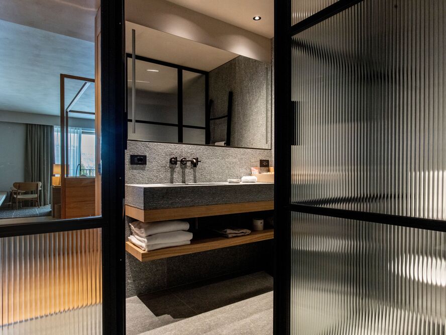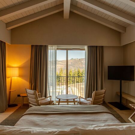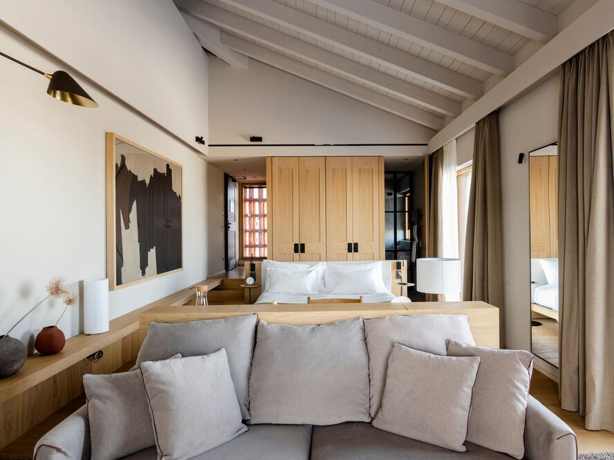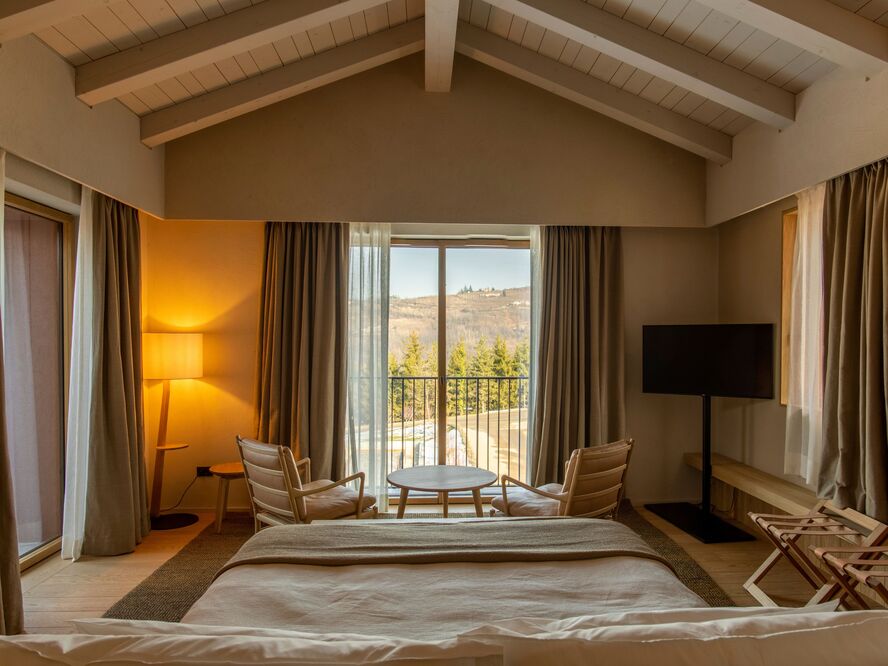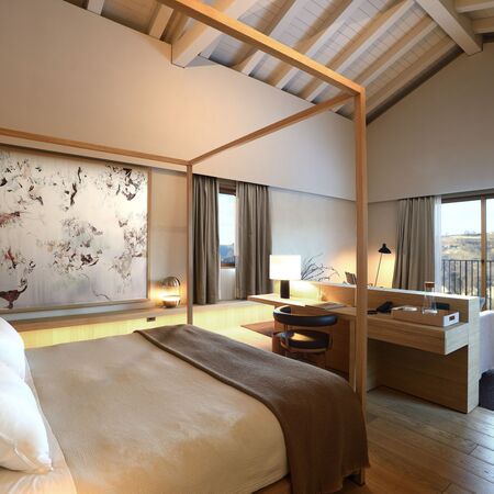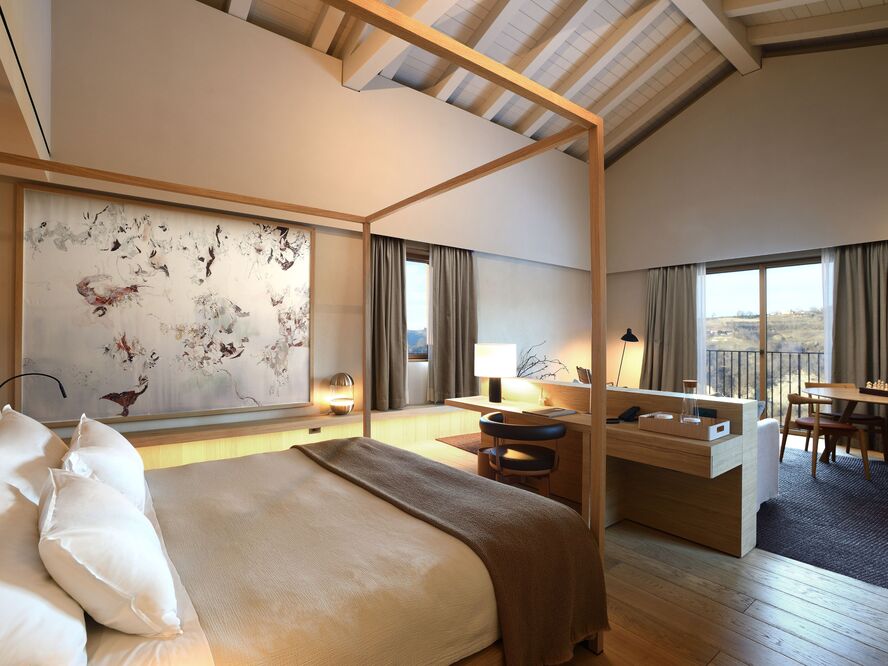 Superior Room (30-35 sqm) Enhanced spaces with panoramic vineyard views, elegant furnishings crafted from local materials, and luxurious marble bathrooms with rainfall showers.
