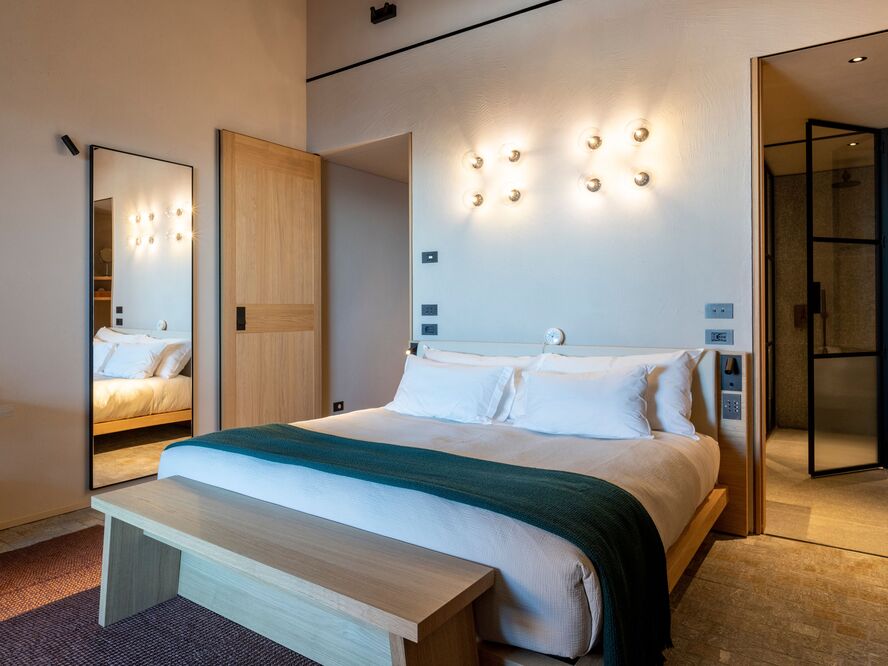 Monviso Suite (50 sqm) Exclusive suites with panoramic 50-square-meter terraces offering breathtaking views of the historic Serralunga d'Alba Castle and the Piedmont Alps.