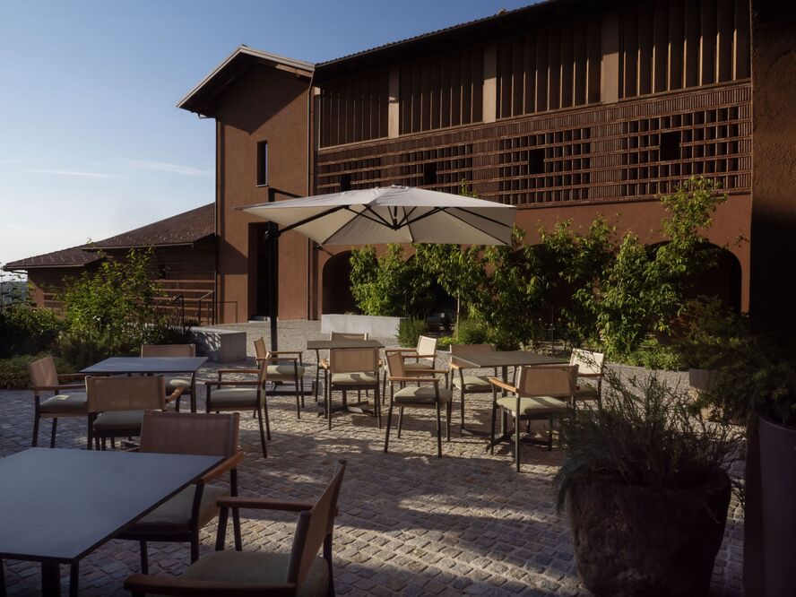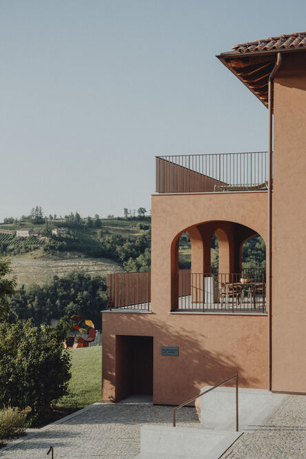 Casa di Langa offers 39 thoughtfully designed accommodations, each featuring private terraces and views of the surrounding vineyards and Alps: