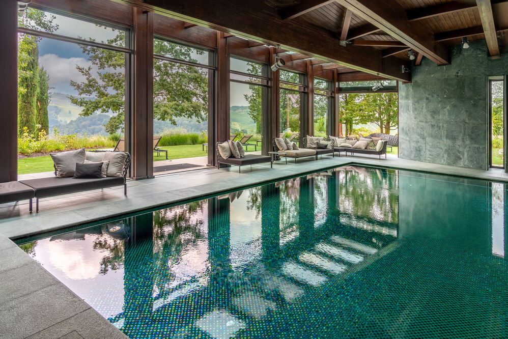 Unlike traditional Langhe villas, Il Boscareto embraces contemporary design with floor-to-ceiling windows that frame the picturesque landscape. Luxuriant nature defines every corner, from the hanging gardens to the pool gardens extending toward the estate's vineyards. The property is surrounded by the Batasiolo winery, also part of the Dogliani family estate, producing some of the Langhe's greatest wines.