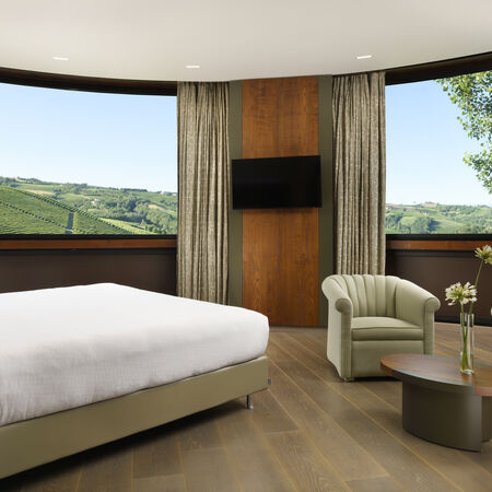 Deluxe Room - Enhanced rooms with large panoramic windows overlooking Langhe vineyards. Superior space with refined silk fabric walls and contemporary design elements.