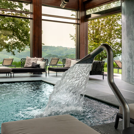 La Rei Natura, the two-Michelin-star restaurant led by chef Michelangelo Mammoliti, celebrates the territory through natural, instinctive cuisine. The La Sovrana Spa spans two floors with pools, treatments, and wellness facilities. Every architectural element opens to spectacular landscape views, making the Langhe's natural grandeur the resort's absolute protagonist.
