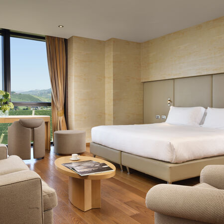 Terrace Suite - Luxurious suites with expansive private terraces and floor-to-ceiling windows. Breathtaking 360-degree views of vineyards, countryside, and surrounding peaks of the Langhe region.
